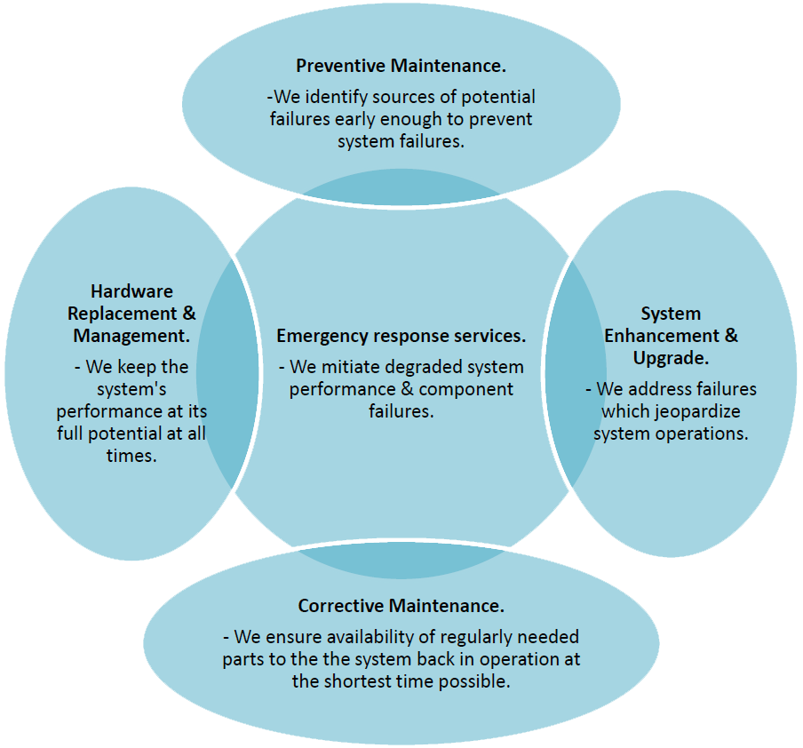 - Corrective Maintenance - We ensure availability of regularly needed parts to the the system back in operation at the shortest time possible.